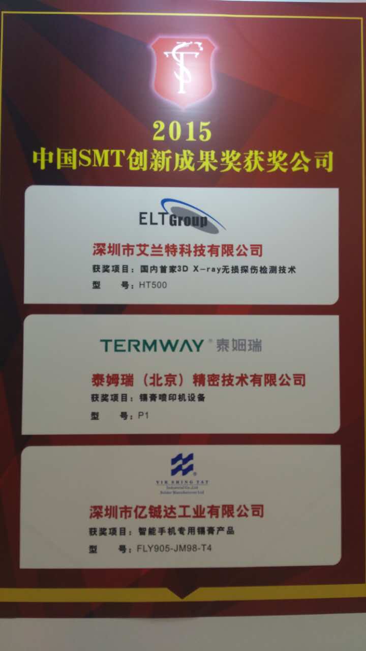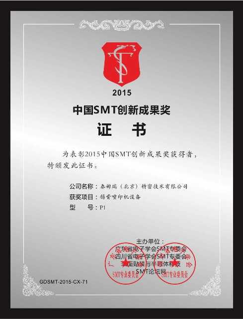 泰姆瑞(北京)精密技术有限公司新研发的国内全自动锡膏喷印机P1,荣获SMT协会颁发的中国SMT创新成果奖。