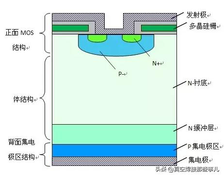 IGBT(真空共晶炉)芯片在结构上是由数万个元胞(重复单元)组成,工艺上采用大规模集成电路技术和功率器件技术制造而成[2]。每个元胞结构如下图2所示,可将其分成体结构、正面MOS结构及背面集电极区结构三部分。