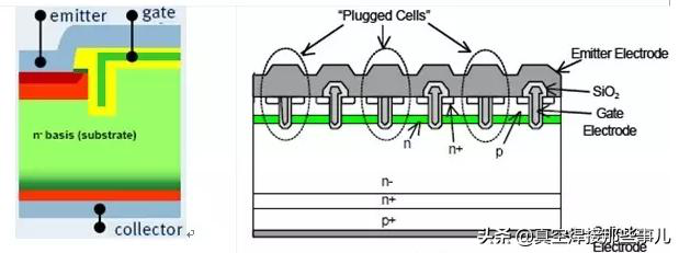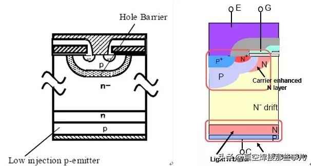 IGBT的集电极区结构影响着PNP晶体管的增益,对正向压降与关断损耗都有重要的影响。早期的穿通型IGBT其集电极区结深较大,空穴注入效率很大,容易发生闩锁效应,必须采用局部寿命控制技术来控制背部空穴注入效率,但是却因此面导致了导通压降的负温度系数,不利于并联应用。后来出现的非穿通型IGBT,采用了透明集电极结构,