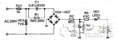 由于电容降压电源是一种非隔离式电源,在通电瞬间会产生很大的电流,也就是所谓的浪涌电流。此外,由于外界环境的影响(如雷击) 电网系统会侵入各种浪涌信号,有些浪涌会导致LED的损坏。所以,要提供热敏电阻保护,这个主要有负温度系数热敏电阻保护(NTC热敏电阻,NTC是Negative Temperature Coefficient的缩写)和正温度系数热敏电阻保护(PTC(Positive Temperature Coefficient))然后有瞬态电压抑制器保护((Transient Voltage Suppressor),简称TVS)