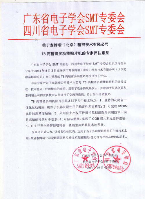多功能贴片机T8是泰姆瑞自主研发设计的一款多功能视觉贴片机,可以贴装01005元件。在2014深圳电子装备展进行展出,并备受行业专家关注。经过广东省电子学会、四川省电子学会多位知名SMT专家的联合评审、检测,给出了以下评估意见: